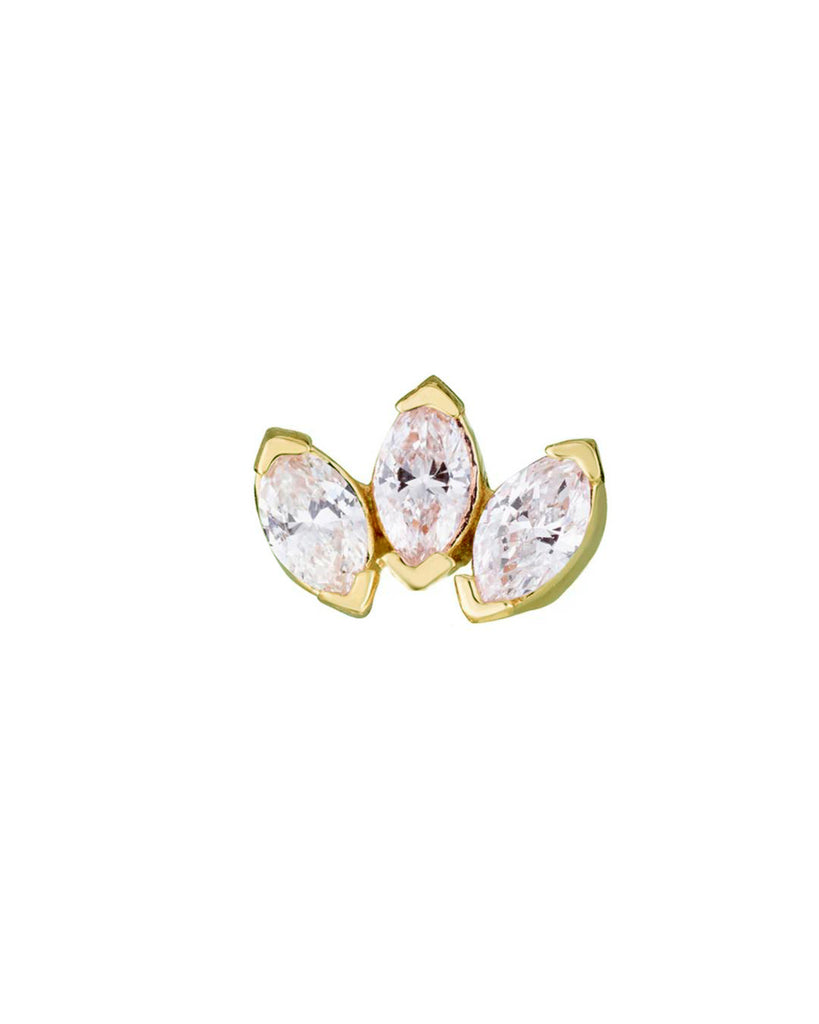 Drei kleine, unterschiedlich aufgereihte Navette Diamanten (natürliche Diamanten!): Ideal für das Helixpiercing, Traguspiercing, Conchpiercing oder auch als ganz normales Lobe Piercing (Ohrstecker): mit einer Dicke von 1,2 mm und Innengewinde wird das Mini Motiv aufgeschraubt. Selbstverständlich sind in dem kleinen Schmuckstück nur echte, natürliche Diamanten verarbeitet! Insgesamt ist das Schmuckstück nur knapp 5 Millimeter breit und 4 Millimeter hoch.