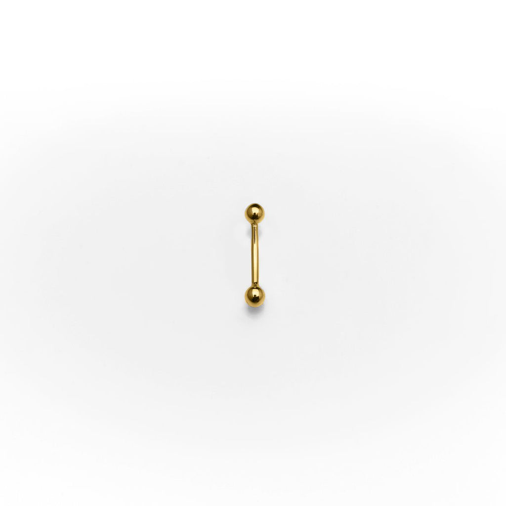 Süße Minibanane in 18 kt Gold, mit einer Stärke (Dicke) von 1,2 Millimeter und zwei massiven Kugeln. Davon ist eine Kugel fest verlötet, und die Zweite ist mit einem 1,2 mm Gewinde auf oder abzuschrauben. Suchen Sie sich in Ruhe ihre benötigte Länge und Größe der beiden Kugeln aus.